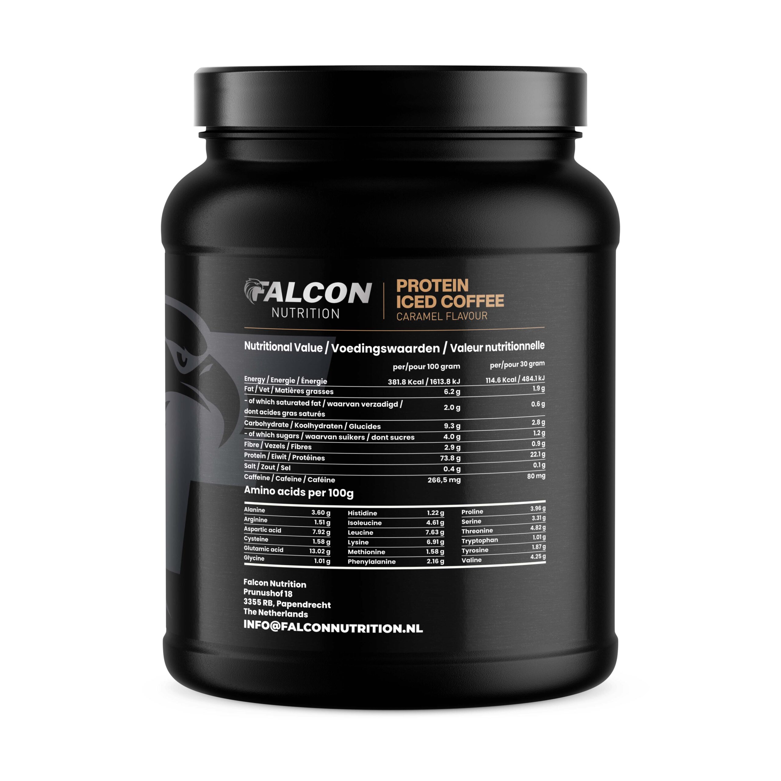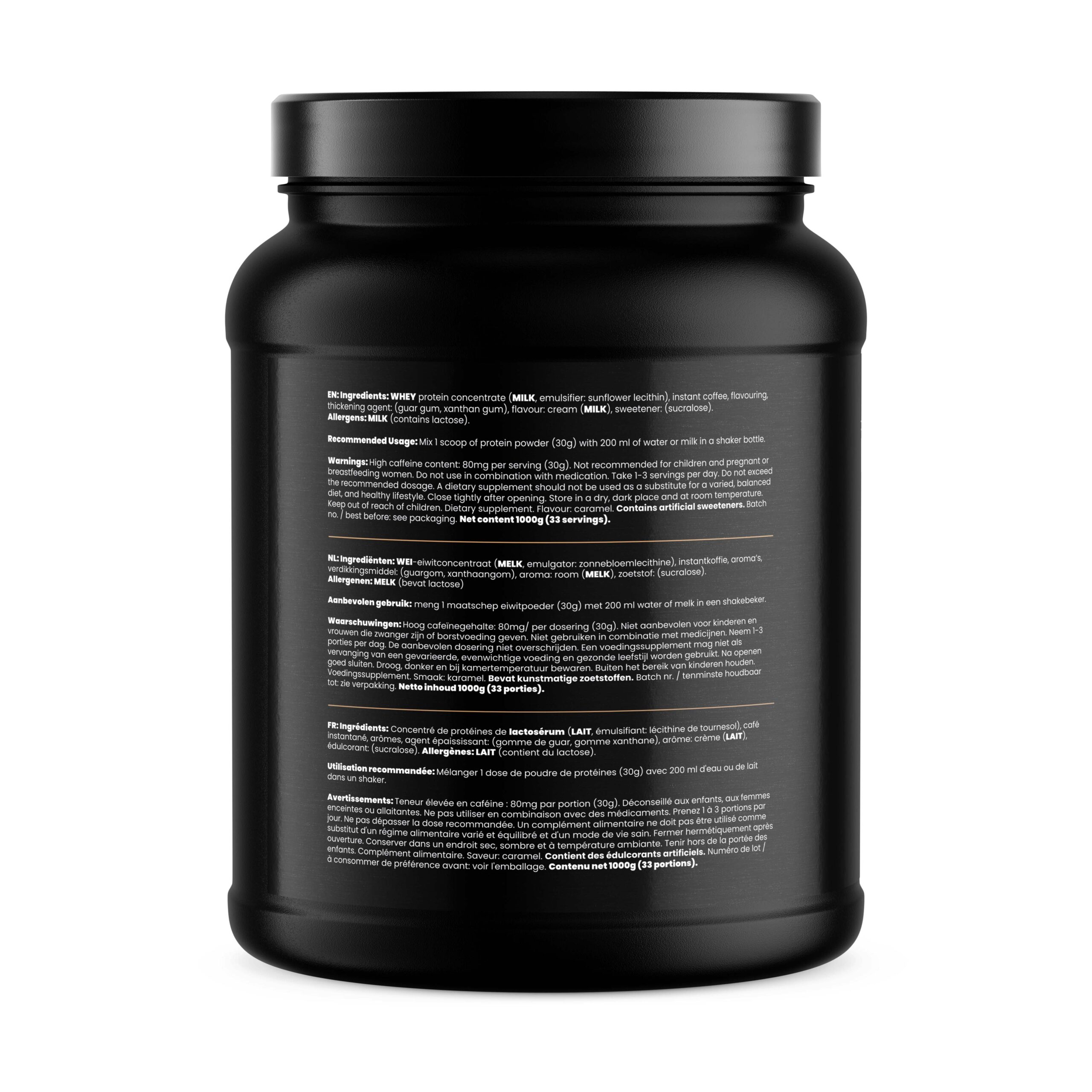 WEI-eiwitconcentraat (MELK, emulgator: zonnebloemlecithine), instantkoffie, aroma’s, verdikkingsmiddel: (guargom, xanthaangom), aroma: room (MELK), zoetstof: (sucralose).