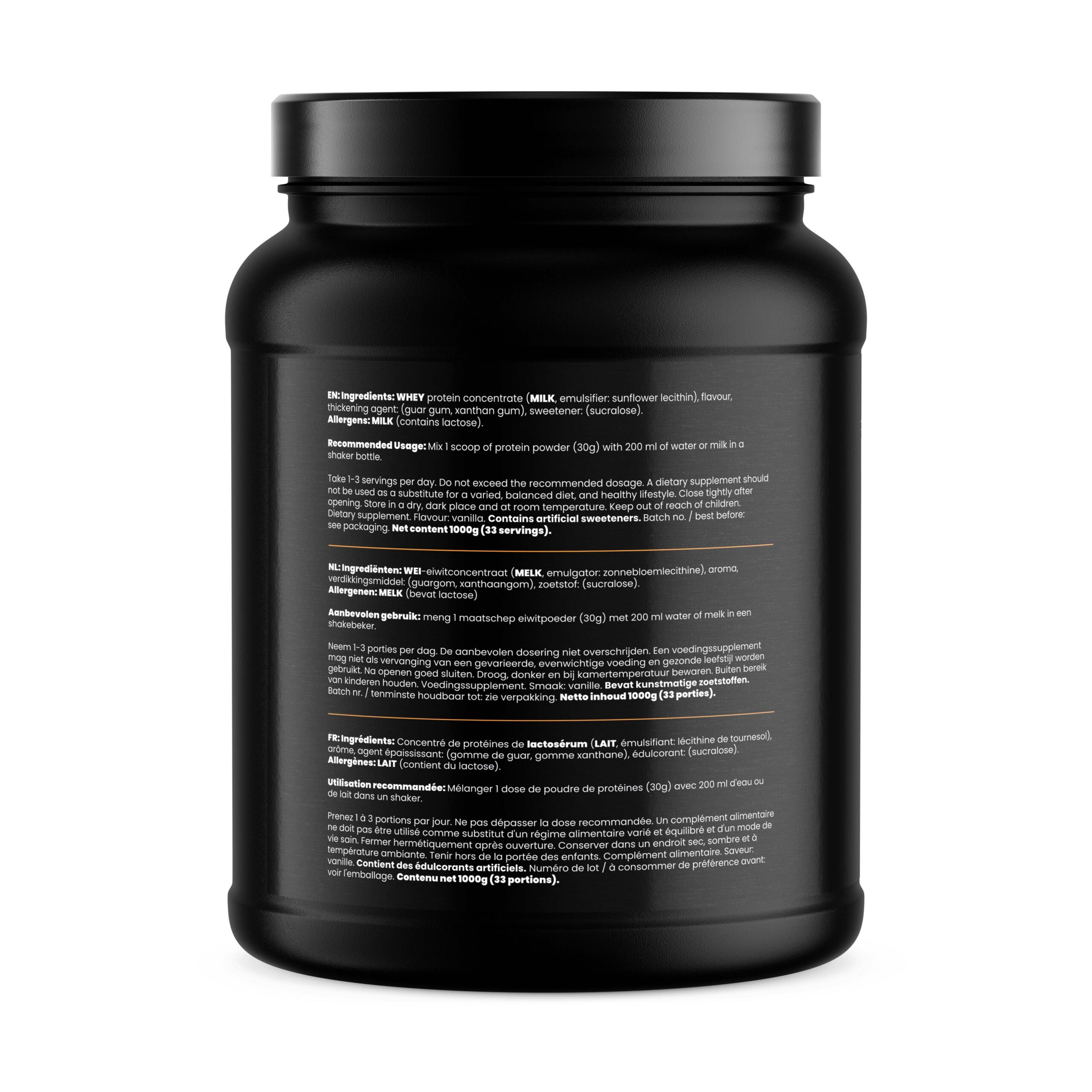 Ingrediënten: WEI-eiwitconcentraat (MELK, emulgator: zonnebloemlecithine), aroma, magere cacaopoeder, verdikkingsmiddel: (guargom, xanthaangom), zoetstof: (sucralose). Allergenen: MELK (bevat lactose)